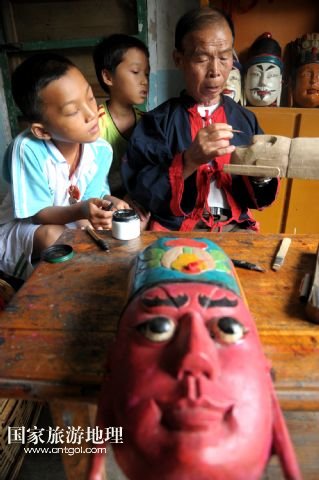 譚圣慈老人今年72歲,從22歲開始學(xué)雕刻儺戲面具,迄今,已經(jīng)堅(jiān)持了50年。老人說,他制作的面具因工藝精湛,造型優(yōu)美,曾吸引遠(yuǎn)方的客人高價(jià)購買。但是,卻少有人來學(xué)習(xí)面具的雕刻與制作。儺戲于2006年被列入非物質(zhì)文化遺產(chǎn)名錄之后,政府加大了保護(hù)力度,但因?yàn)槊婢叩闹谱髦芷陂L、工序復(fù)雜,銷售渠道少等原因,仍無法吸引年輕人學(xué)習(xí)雕刻的興趣。為了收到心儀的徒弟,傳承這獨(dú)到的技藝,他到處發(fā)布免費(fèi)收學(xué)徒的信息。在他的堅(jiān)持下,今年暑期,鄉(xiāng)里有兩名對面具制作感興趣的男孩來到譚圣慈身邊學(xué)藝。老人高興地說:“我給他們講很多故事,就是希望他們能對此提起興趣,愛上木面雕刻,別讓這老手藝失傳了。” /新華社發(fā)