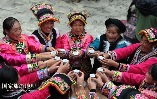 國(guó)家旅游地理 四川阿壩11月2日訊 11月2日,身著節(jié)日盛裝的四川省阿壩州汶川縣龍溪鄉(xiāng)村民們舉杯迎接羌?xì)v新年的到來。當(dāng)日,四川省阿壩州汶川縣龍溪鄉(xiāng)舉行傳統(tǒng)儀式迎接即將到來的羌?xì)v新年。今年的11月3日農(nóng)歷十月初一是羌?xì)v新年,這是羌族一年中最為隆重的“慶豐收、送祝福、祈平安”的節(jié)日,按民間習(xí)俗,過羌年時(shí)要還愿敬神,全寨人歡聚一堂,吃團(tuán)圓飯,共慶佳節(jié)。 /新華社發(fā)(何海洋 攝)