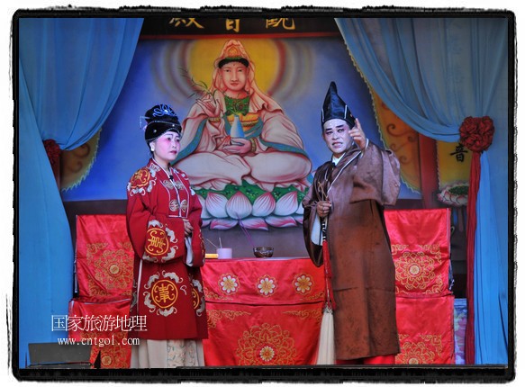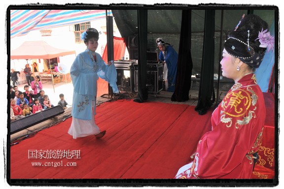 江西省婺源縣賦春鎮(zhèn)源頭村景區(qū)邀請(qǐng)了安徽黃梅戲劇團(tuán)在村門(mén)口為村民表演輪翻上演黃梅戲